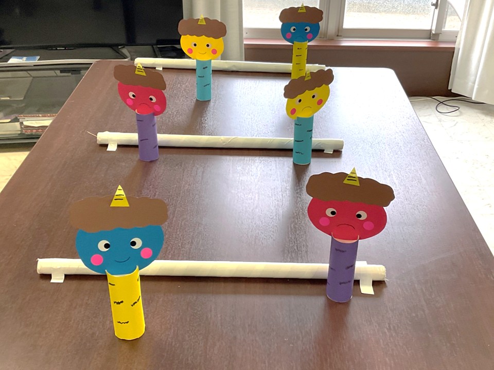 一番奥の鬼がなかなか倒れず、うちわを大きく振り上半身のいい運動になりました♪