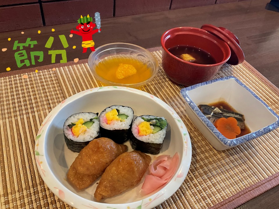 2月3日は節分です!まきむく草庵でも毎年恒例の恵方巻が登場しました!他にもいなり寿司、いわしのうめ煮など節分にちなんだメニューやお麩の入った赤だし、デザートはみかんゼリーをお楽しみいただきました(^^)