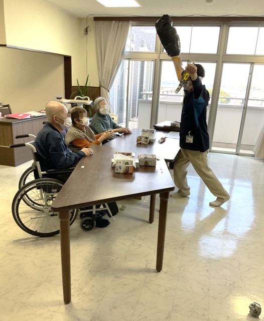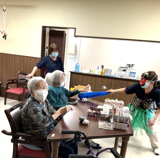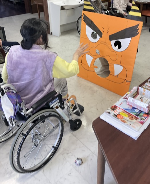 今年も施設内に鬼が登場!皆様、「待ってました!」と言わんばかりに、手作りの豆(新聞紙を丸めた物)を手に構えられていました。