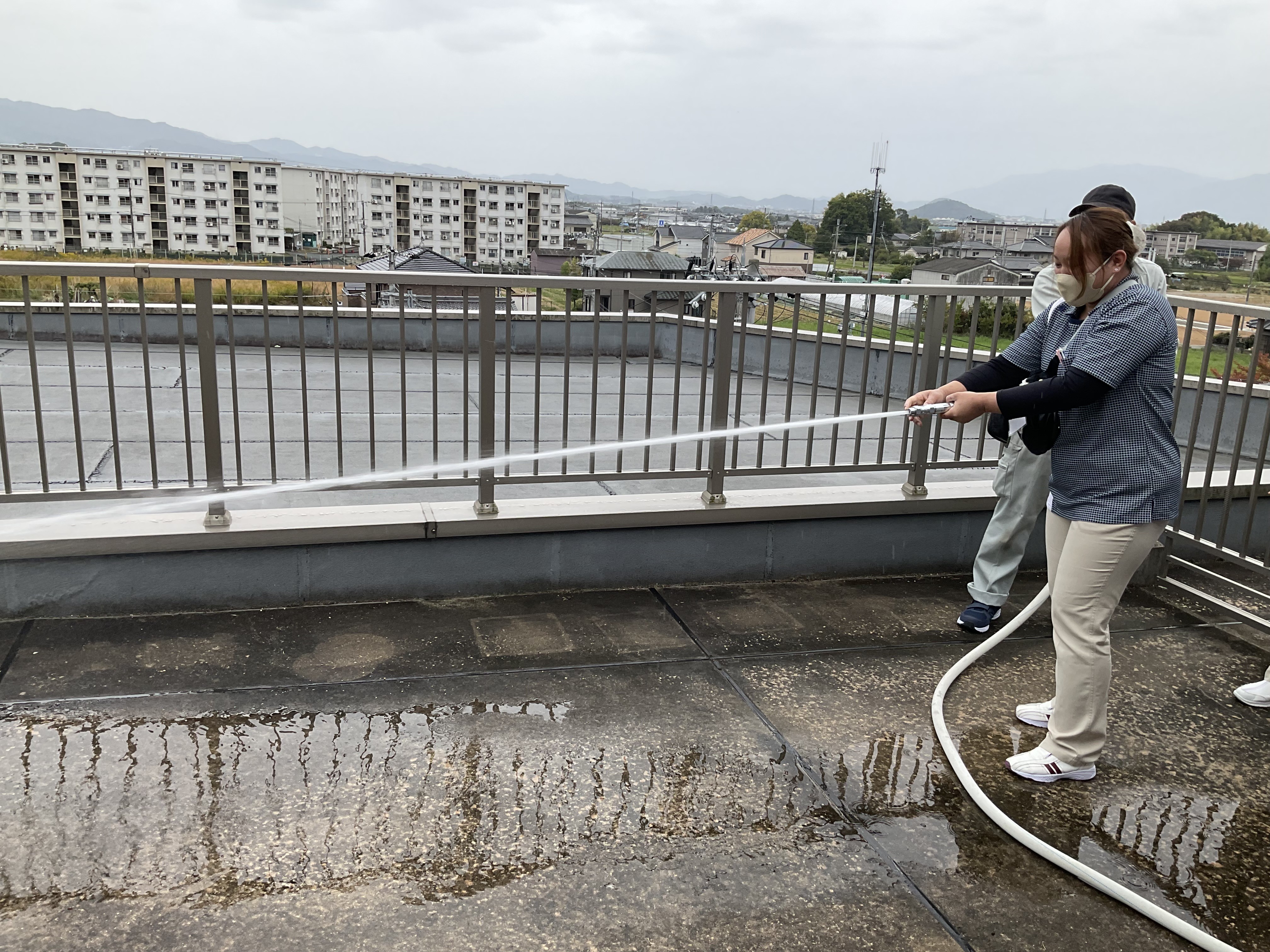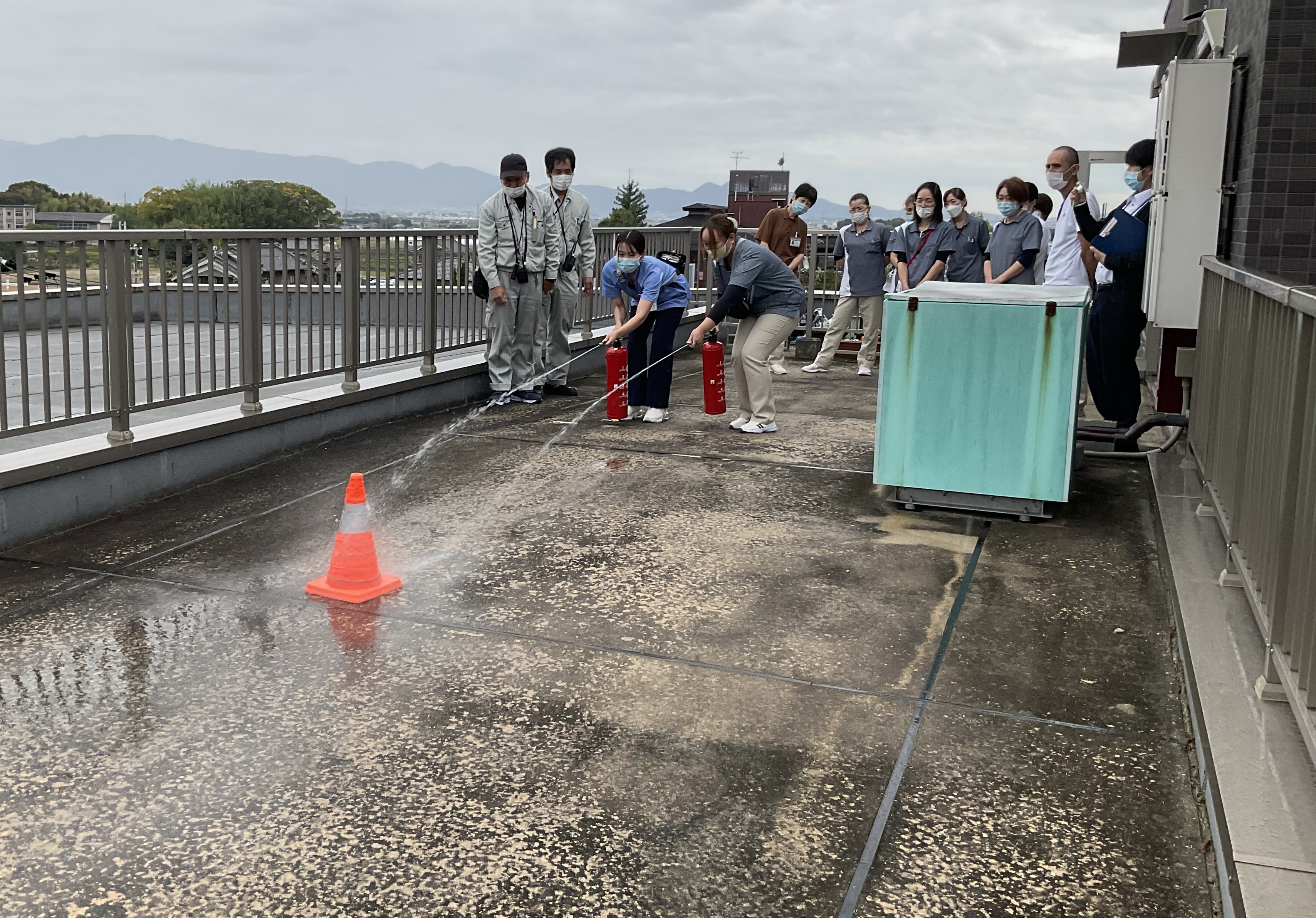 火災報知器は作動するか、消防署への通報システムは使えるかなど消火設備の点検を専門の業者さんにしてもらい、消火器や消火栓の使い方などを教わります。