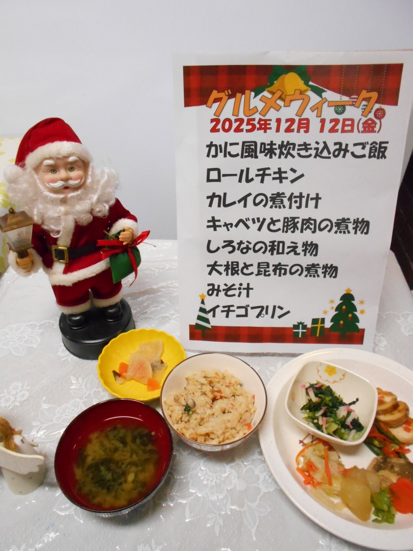 デイサービスやまのべでは、毎月グルメウィークとしてビュッフェの提供や、月2回のグルメデー等、ご利用中『食』についても楽しんで頂ける様取り組んでおります。12月の旬の食材や、クリスマスをイメージしたランチプレート等でご準備しました。
